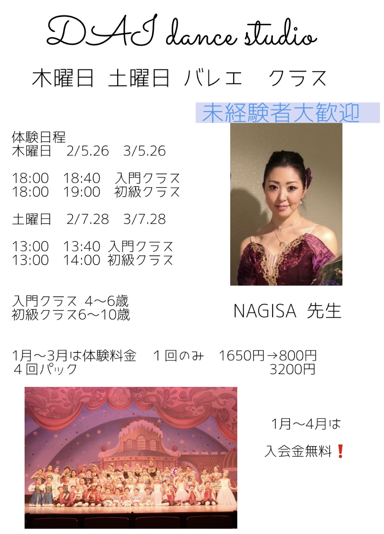 土曜日 13:00〜13:40 入門クラス Nagisa先生 5,500円 生徒募集中